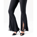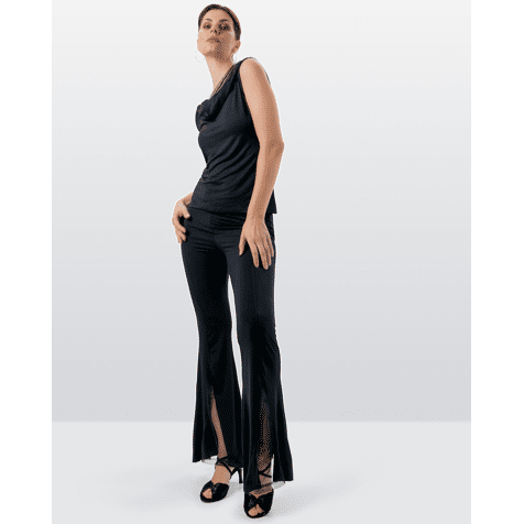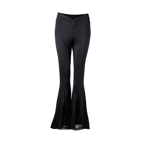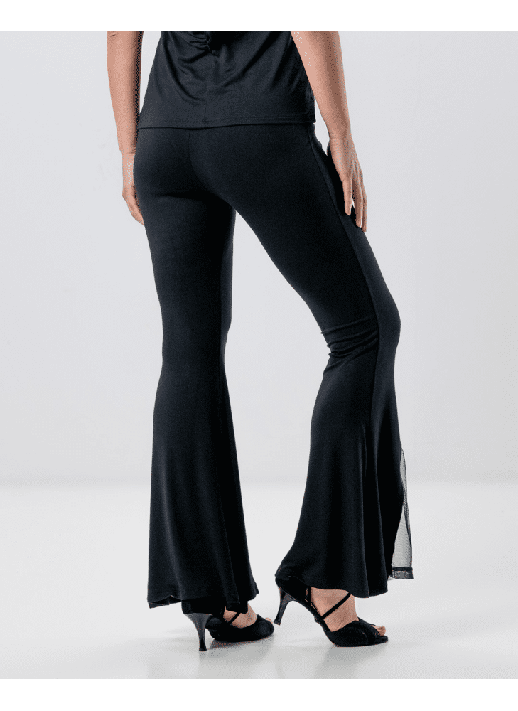 - De Nisha-dansbroek voor vrouwen in klassiek zwart maakt indruk met zijn slim uitlopende pijpen, elastische tailleband en delicate mesh-inzetstukken.