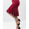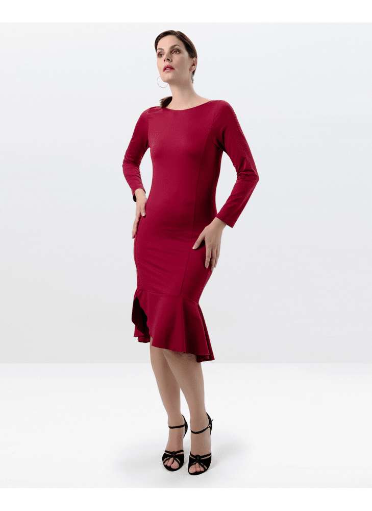- Zuri is een bordeauxrode dansjurk met ruches aan de zoom en een vrouwelijk silhouet.