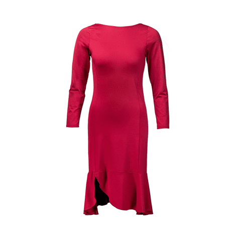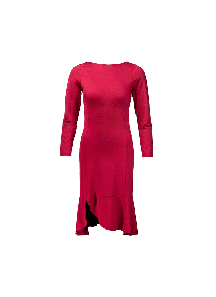 - Deze gracieuze jurk valt op door zijn vrouwelijke silhouet en vloeiende bewegingen. De getailleerde pasvorm wordt prachtig aangevuld door een licht uitlopende zoom met ruches en een split aan de zijkant, perfect om elke dansstijl een vleugje elegantie te geven. Een subtiel gevormde boothals en de zachte, elastische stof in bordeauxrood bieden maximaal comfort, zelfs tijdens lange dansavonden.